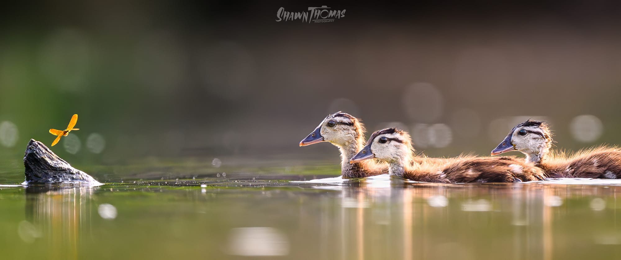 Take these ducklings and their curiosity about a dragonfly. In a standard 3:2 crop you’d have sky and water that add nothing. Strip that away and the interaction itself becomes the star.