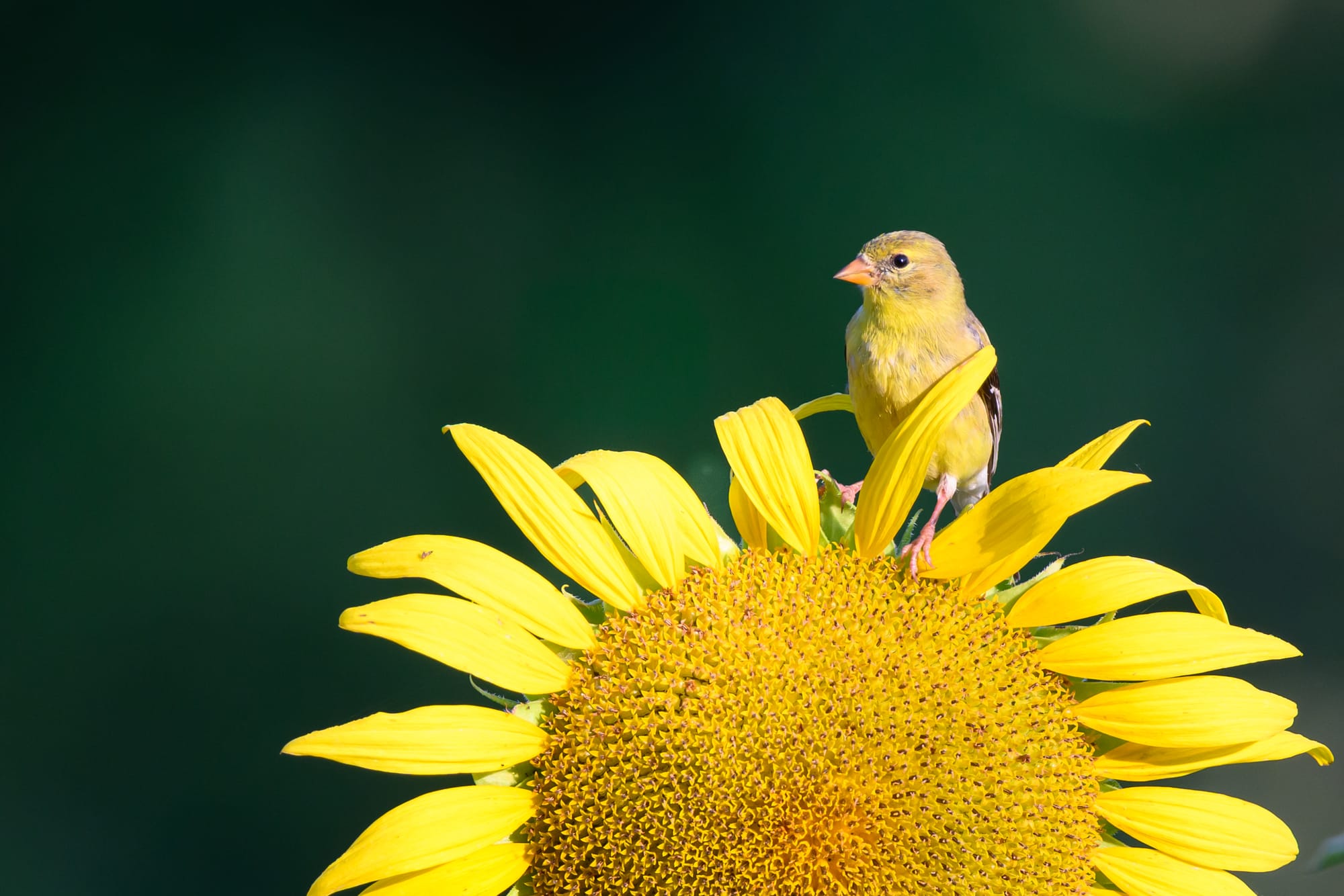 The left image is fine. A goldfinch on a sunflower, clean background, nice light. Technically nothing wrong with it. But look at the right frame. Same bird, same flower, same light, except now there's a dragonfly arriving and the bird is reacting to it. The whole image has a story now. Something is happening.